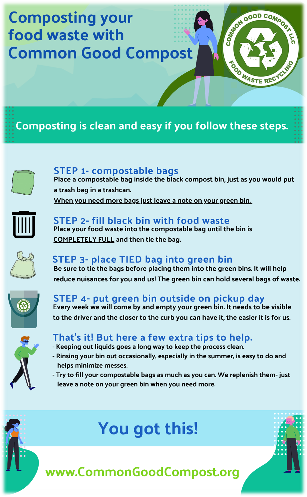 A free starter kit: 2.5-gal indoor bin with liners and a 5-gal outdoor bin with lid. Weekly curbside pickup is included.